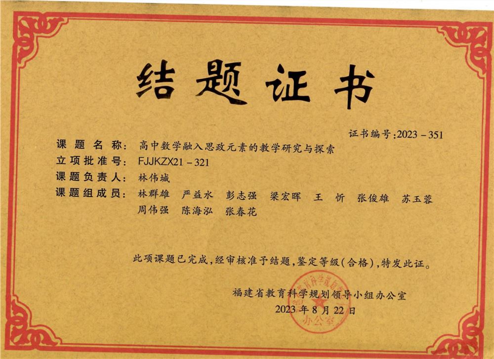 其中,数学教研组围绕“高中数学融入思政元素的教学研究与探索”校本研讨主题,立项福建省教育科学“十四五”规划课题“高中数学融入思政元素的教学与探索”(立项批准号:FJJKZX21-321)并顺利结题。