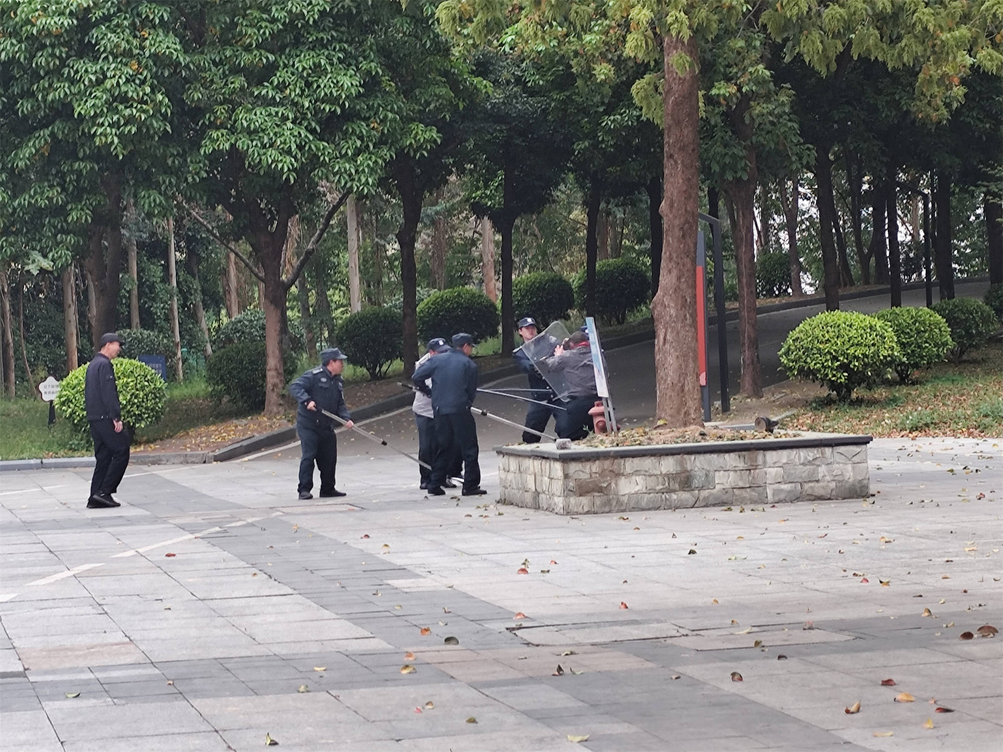 活动中,演练采取现场模拟突发事件的形式。一名“歹徒”扮演者在校门口徘徊,想强闯进入校园,安保人员第一时间大声喝止,让其停止侵入并离开。“歹徒”们手持凶器强行闯入校园。在学校有序指挥和各部门的全力配合下,“歹徒”最终被制服,解除危机,整个演练达到了预期效果。
