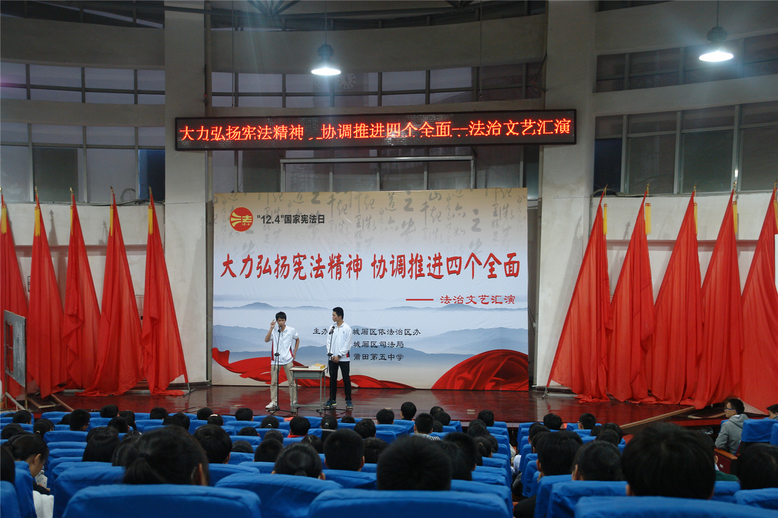 为进一步做好“七五”普法开局工作,组织开展好我市首个“法治宣传月”系列活动,持续深入开展法治宣传教育,弘扬法治精神、培育法治信仰,为全面深化法治城厢建设,构建良好的法治氛围,在第3个国家宪法日到来之际,围绕习近平总书记对“五四宪法”历史资料陈列馆作出的重要指示,为大力普及宪法知识增强宪法意识,弘扬宪法精神,推动宪法实施,让法治成为“国家信仰”。12月2日下午,由城厢区依法治区办、司法局、教育局、莆田第五中学联合主办的12.4国家宪法日暨全国法制宣传日系列活动在莆田第五中学隆重举行。
