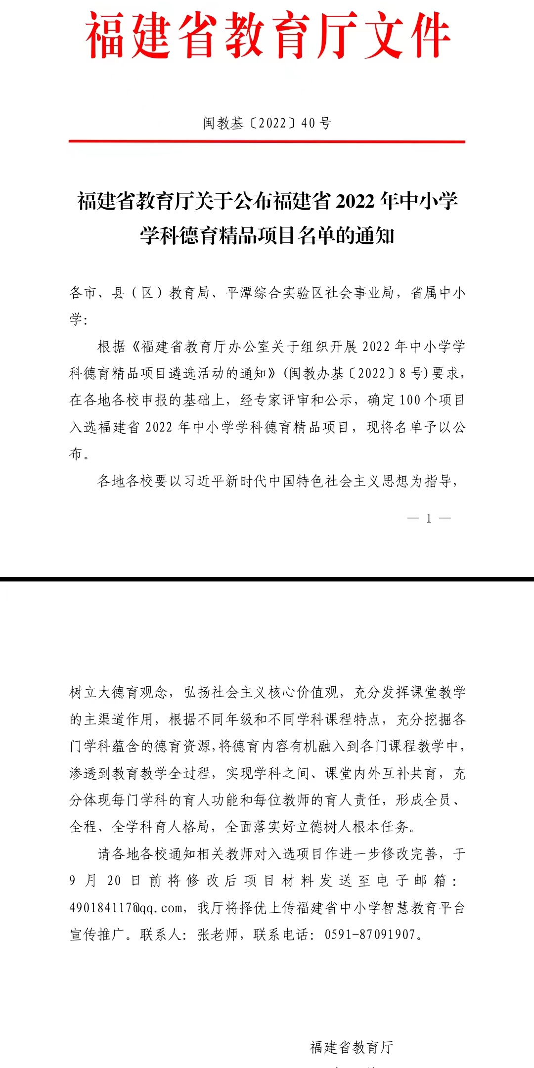 日前,福建省教育厅发布《福建省教育厅关于公布福建省2022年中小学学科德育精品项目名单的通知》(闽教基〔2022〕40 号),在各地各校申报的基础上,经专家评审和公示,确定了100个项目入选福建省2022年中小学学科德育精品项目。