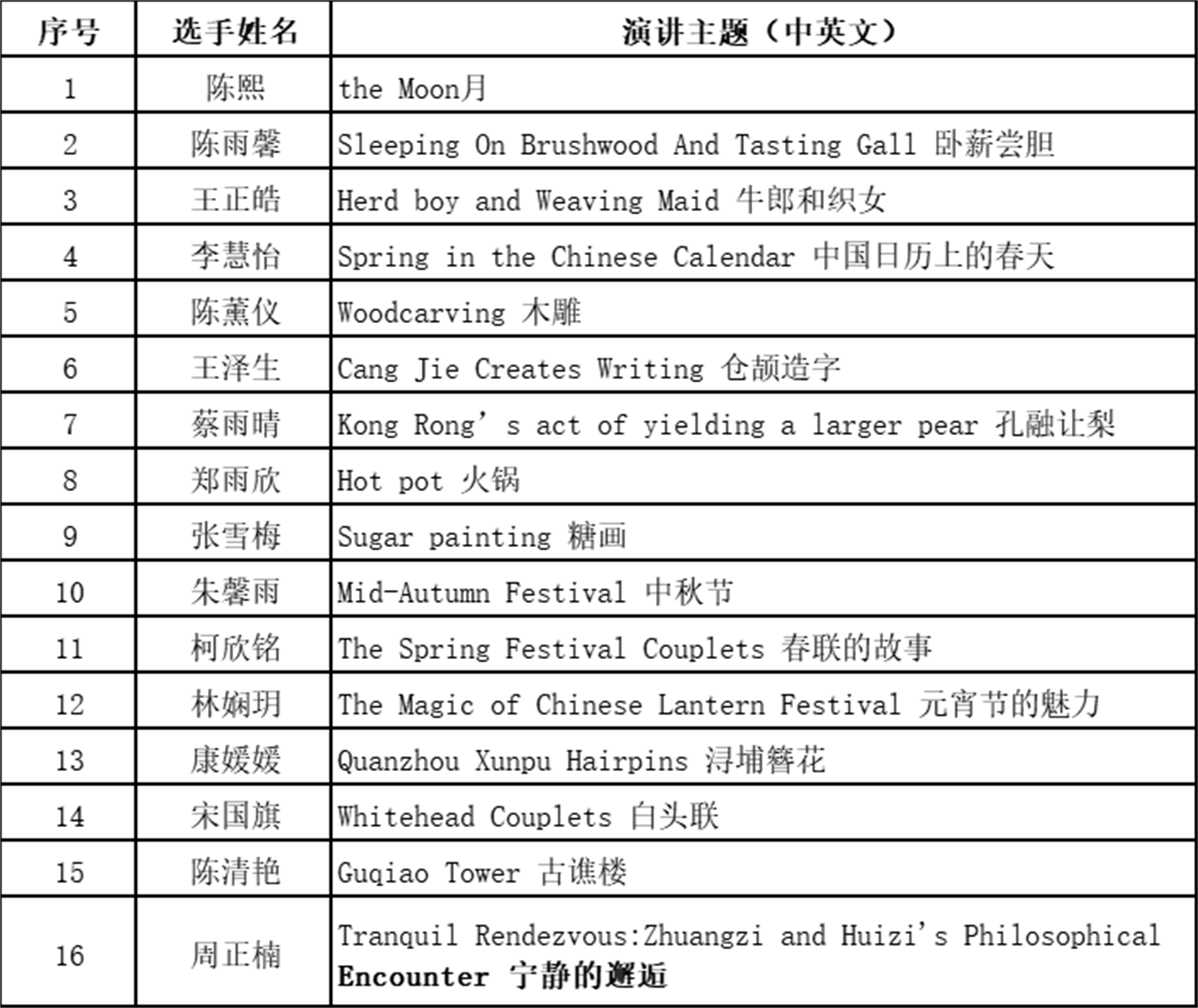 “用英语展示中华文化,在故事里读懂中国”------ 复选活动分为主题演讲和现场问答两个环节。选手们在英语老师的精心指导下,为大家带来了一场用英语讲述中国文化的盛宴。活动激励全体师生从优秀的中国文化中汲取中国智慧、弘扬中国精神、传播中国文化,不断增强文化自信,同时也展示了我校英语学科的教学成果。选手们的演讲主题如下: