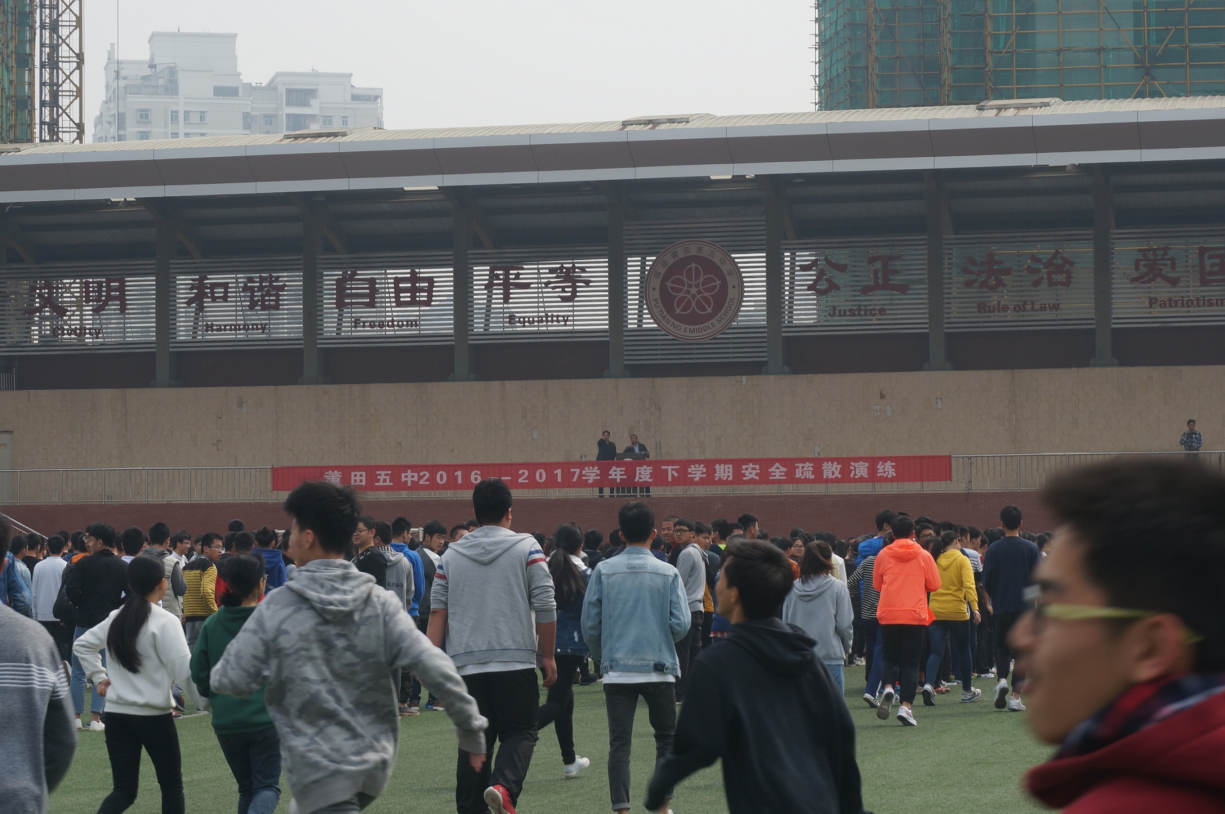2017年3月30日,我校利用课间操时间举行全校防踩踏应急疏散演练。共2887名师生参演,用时4分55秒。演练结束后傅锦国党委副书记对本次演练进行点评总结,傅副书记要求全体参演人员要认真落实安全职责,提高演练真实性,确保演练各环节安全顺利。通过本次防踩踏演练提高师生防踩踏的自救互救能力。